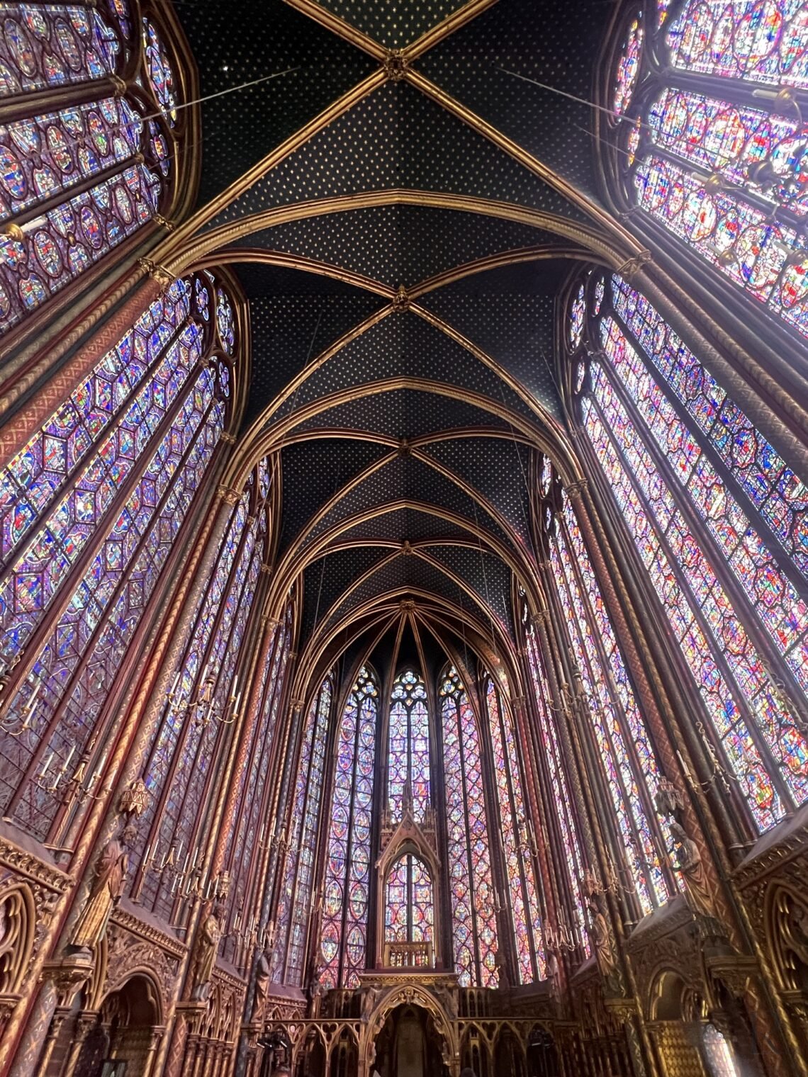 第一次走進聖徒禮拜堂,我真的愣住了, 那不是只能用「漂亮」形容,而是會讓人瞬間安靜下來的那種震撼。上層禮拜堂的牆面幾乎全部被彩繪玻璃取代, 陽光透過 15 公尺高的窗戶灑進來, 整個空間像是被浸在寶石裡, 藍、紅、金色在空氣中流動,像一場光的儀式。