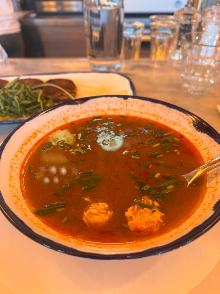 我到的時候是快晚上7點,沒有預約,結果海鮮類都不能點了(說要保留給有預約的客人),還好我其實沒有很餓,所以沒有點主食,畢竟份量都很大(旁邊有點麵,真的滿多的)。點了龍蝦湯跟蟹餅(3個),個人覺得湯好喝,後來用麵包沾著湯吃,在歐洲喝湯就是要配麵包,這樣對我來說就飽了,真的很容易飽;蟹餅我覺得因人而異,感覺上配醬才比較好吃,比較起來湯比較推。