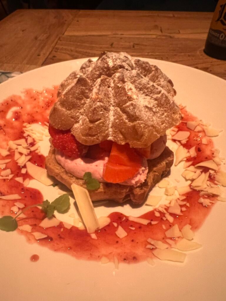 甜點:巴黎泡芙Parijse soes (Parisian Puff),這是荷蘭泡芙,體積大,內餡多會放上新鮮水果,淋上巧克力醬。