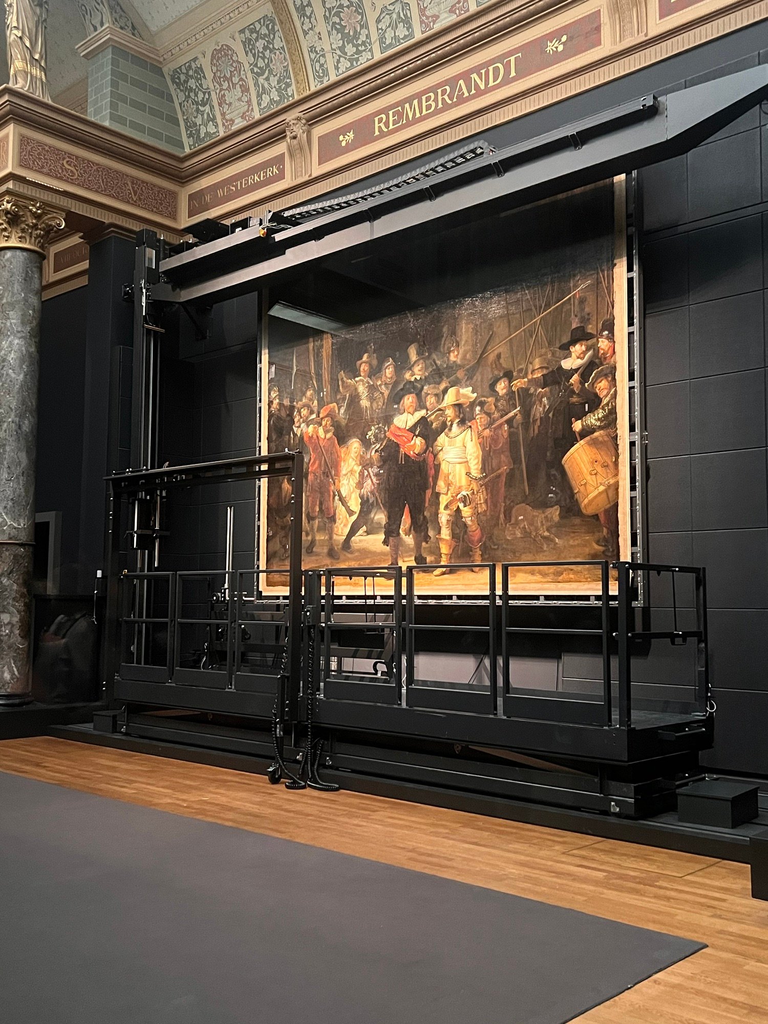 我在展廳中與林布蘭的《夜巡》(The Night Watch)相遇,畫作巨大而震撼,人物栩栩如生,光影交錯間彷彿能聽見士兵們的腳步聲,這不只是技法的高峰,更是荷蘭黃金時代的精神象徵。這時剛好遇到《夜巡》正在修復,這個修復沒有確切的完成日,上一次維護這幅畫是50年前(1975-76年),畢竟這是一幅有380年歷史的畫作,非常珍貴。我覺得荷蘭政府在博物館上的用心非常值得學習,文物修復會展現給民眾觀看,甚至會提供免費語音導覽還會在座椅擺上說明看板,分別畫出重點地方與故事,讓來訪的民眾不至於走馬看花。