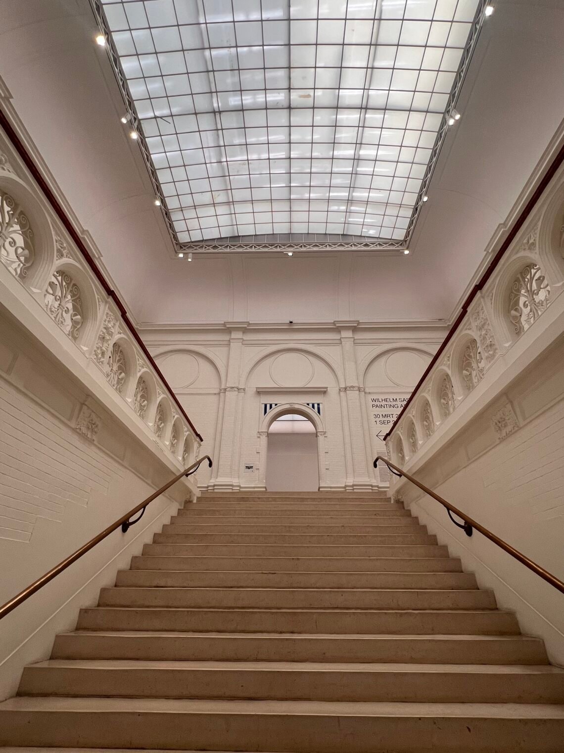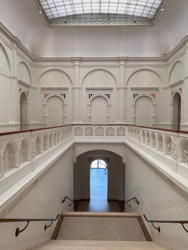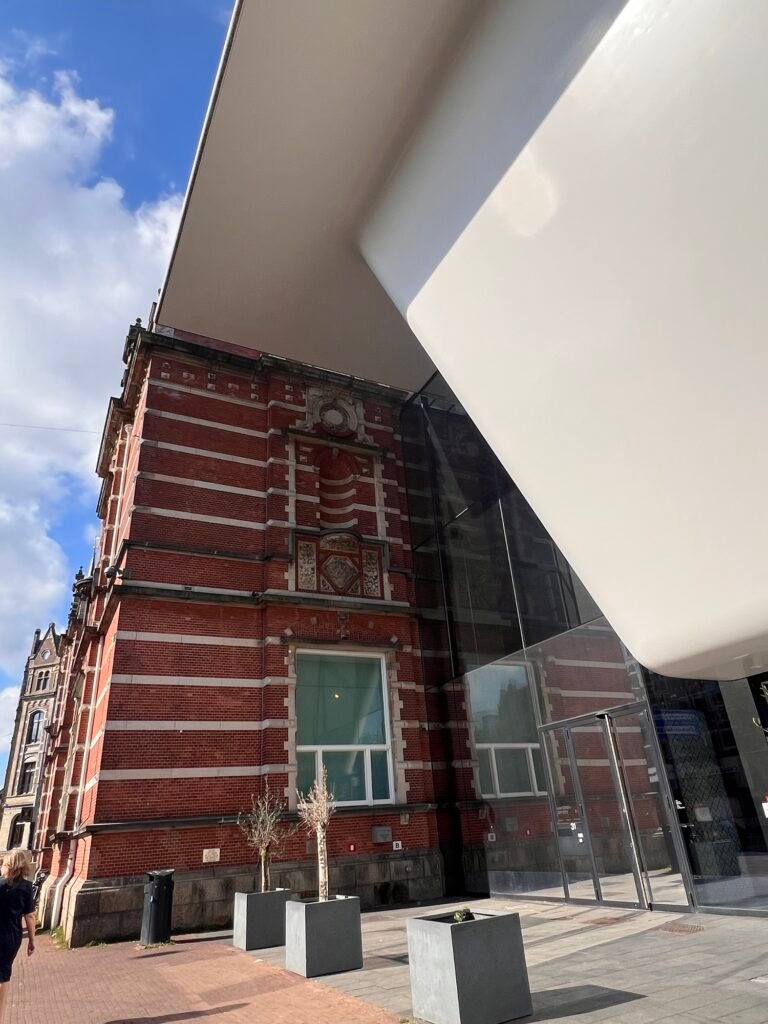 別忘了建築本身也是一大亮點,這是新舊兩館結合在一起,一面外觀非常新穎,其中包含舊建築的部分;新館外觀潔白、造型前衛,被暱稱為「浴缸」(可惜沒拍到像浴缸的外觀),由Benthem Crouwel Architects設計,與原本的19世紀建築形成強烈對比,另外特別要說到走到內部有一處全白的空間,那純白的樓梯跟復古的建築基底,讓我想起京都京瓷美術館的內部翻新後也是一樣使用純白的牆面。
