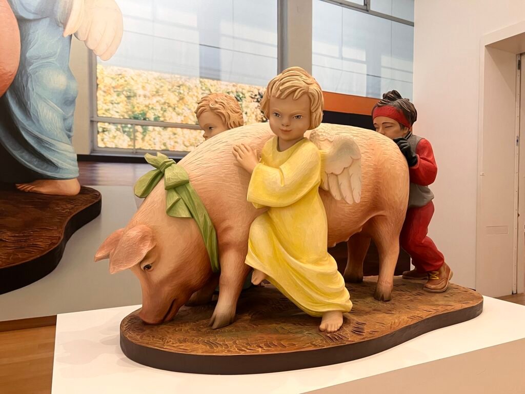 上左圖一:Ushering in Banality 是傑夫・昆斯Jeff Koons (就是氣球狗等造型出名的藝術家)。我現場看到的時候很意外,因為在這之前我只認識他的氣球狗系列的作品,而且非常有趣味,豬後面男孩推著的那位是他的自畫像。