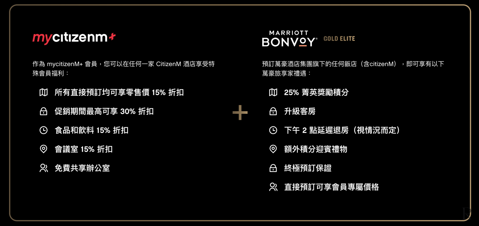而我看到優惠的消息是,現在只要付CitizenM年費「120 美元/100 歐元/90 英鎊」,除了CitizenM的會員優待以外還加上萬豪金卡會員服務,一魚兩吃!!